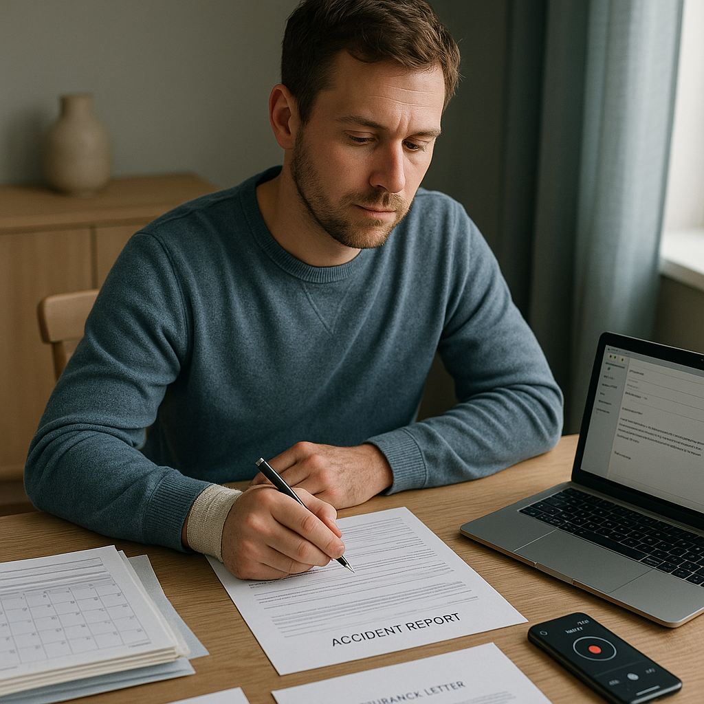 Søg læge tidligt og fortæl om alle gener – også de små. Bed om, at lægen noterer varighed, intensitet og eventuelle begrænsninger i arbejde og fritid. Følg op, hvis nye symptomer dukker op, og gem kopi af henvisninger, røntgen og journalnotater. Uoverensstemmelser mellem din tidslinje og journalen skaber tvivl, så ret fejl skriftligt. Næste skridt er at samle økonomiske beviser, der viser, hvad skaden faktisk har kostet.